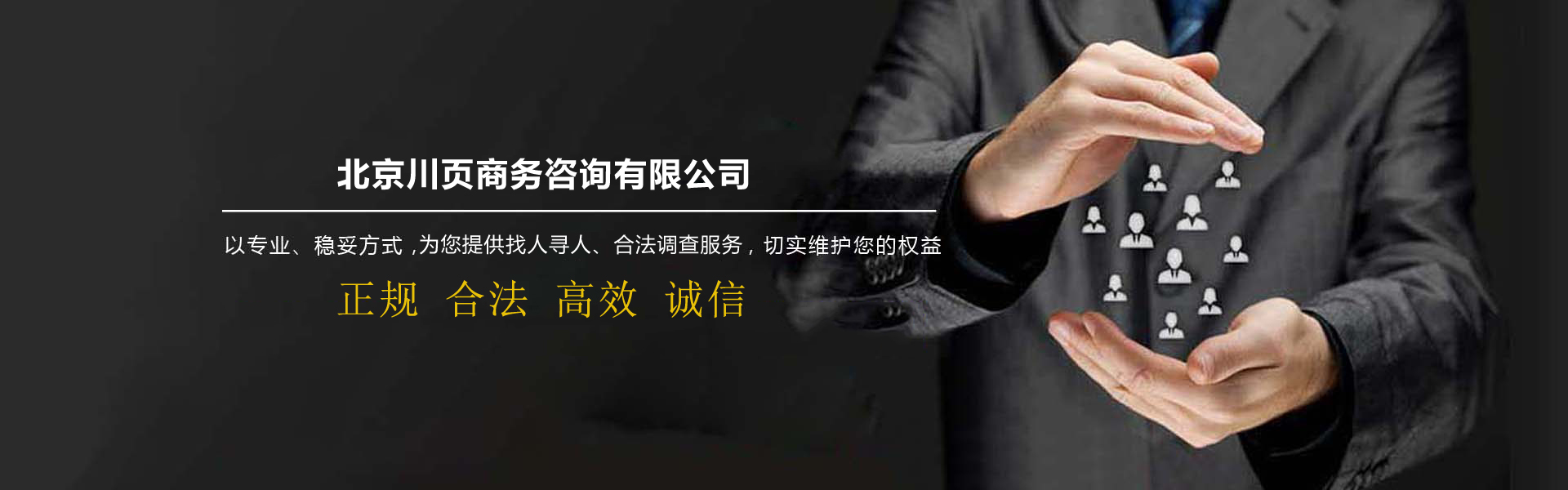 北京市偵探公司-北京川頁商務(wù)咨詢有限公司是面向全國提供找人尋人服務(wù)平臺,公司致力于為企業(yè)、個人解決發(fā)展中各類債務(wù)問題、債權(quán)訴訟、債權(quán)轉(zhuǎn)讓事務(wù),幫助快速尋找親人、朋友、戀人、戰(zhàn)友等找人服務(wù),以及婚姻家庭情感咨詢等業(yè)務(wù)。公司擁有一批律師,商賬管理師專業(yè)的工作人員,依托互聯(lián)網(wǎng)平臺,在國內(nèi)形成了完善的調(diào)查尋人服務(wù)網(wǎng)絡(luò),業(yè)務(wù)范圍已經(jīng)逐漸覆蓋北京及全國各大主要城市和地區(qū)。我們始終秉承"捍衛(wèi)真理、堅持誠信、以人為本、奉獻社會"的服務(wù)理念和"專業(yè)、創(chuàng)新、和諧、共贏"的經(jīng)營理念,我們希望通過提供全面、及時、準確、專業(yè)的相關(guān)信息,以優(yōu)質(zhì)的服務(wù),專業(yè)的技巧,為各位有需求的人員提供服務(wù)!